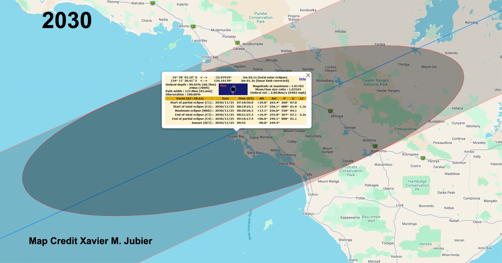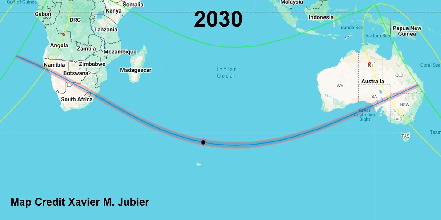 In 2030, the path begins in Africa as a very early-morning eclipse. The path then spends a lot of time over the ocean, ending in Australia as a late afternoon eclipse. There are a couple of interesting things about this path for Australia.