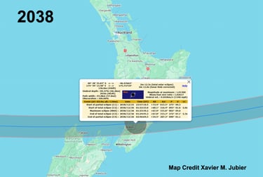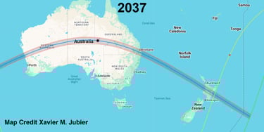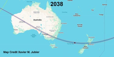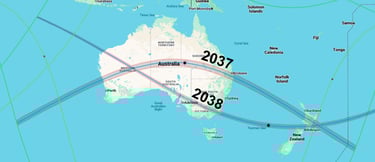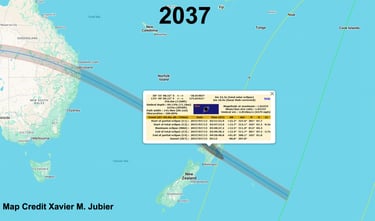 The 2037 and 2038 paths have a broad cross over the mainland, covering a lot of square kilometers. And this is actually a double cross because there is a tiny section of New Zealand that is on the coast that gets the cross, also!