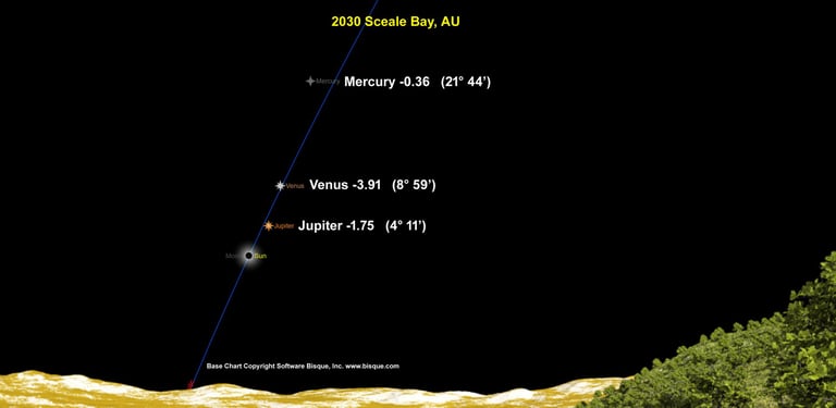 1. The sky chart for Sceale Bay is awesome! The chance to frame Jupiter and Venus with totality. In 2001, Jupiter was visible naked eye at mag -1.93. In 2030, it should be visible at mag -1.75