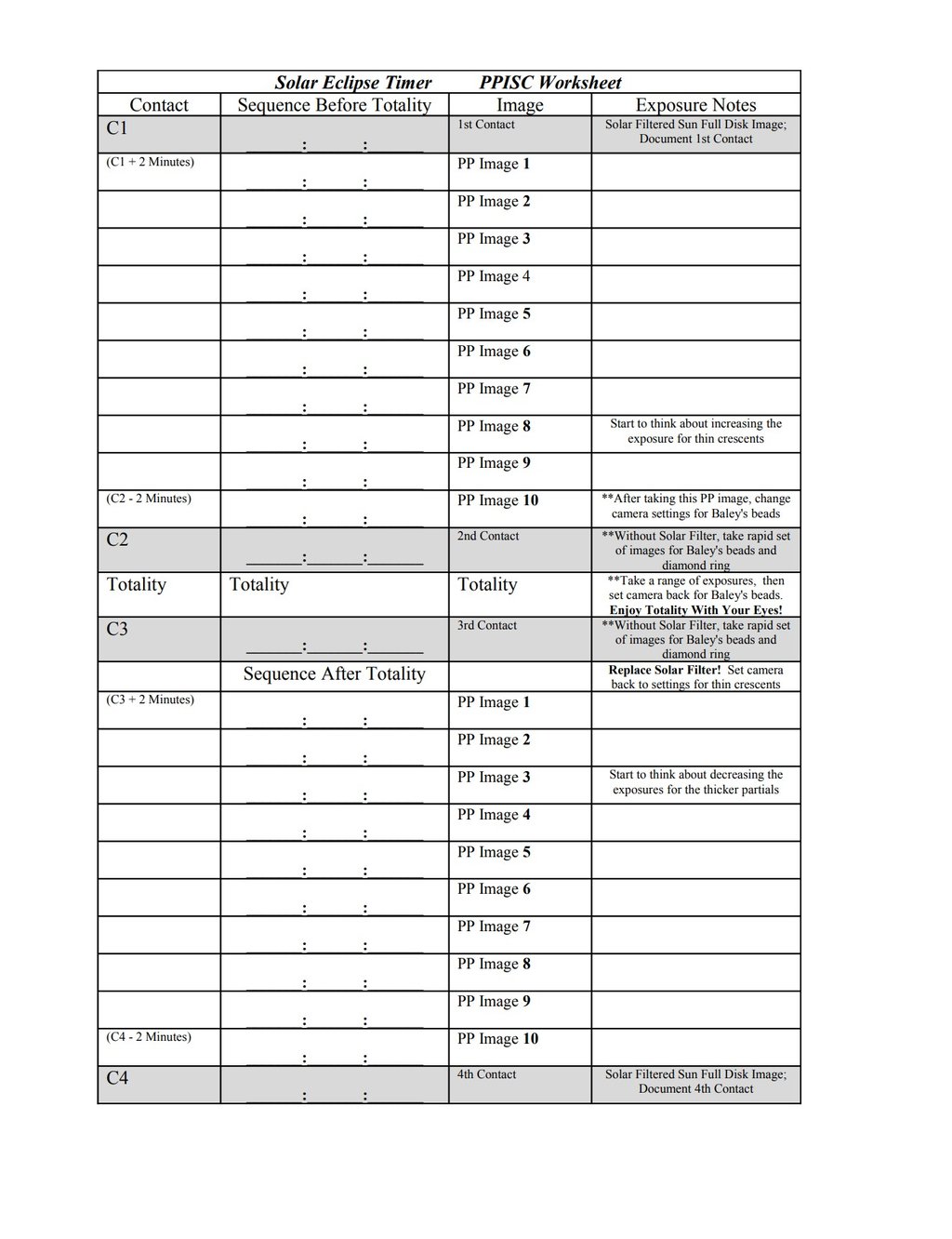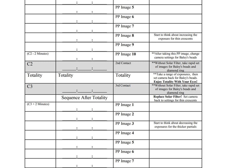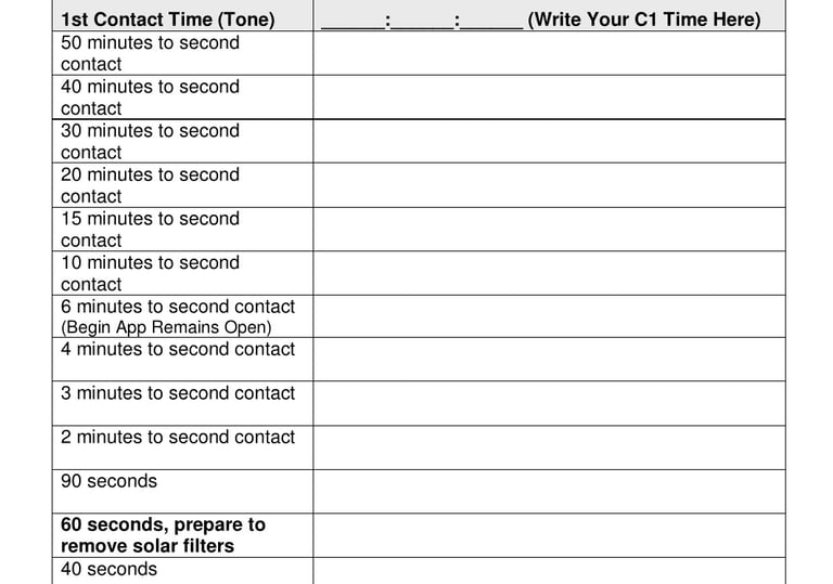 Use this sheet to write down the times generated by the app for your observing position. These are the 20 times that you will take an image to get a perfect partial phase eclipse sequence.