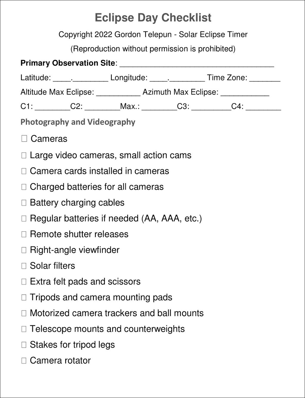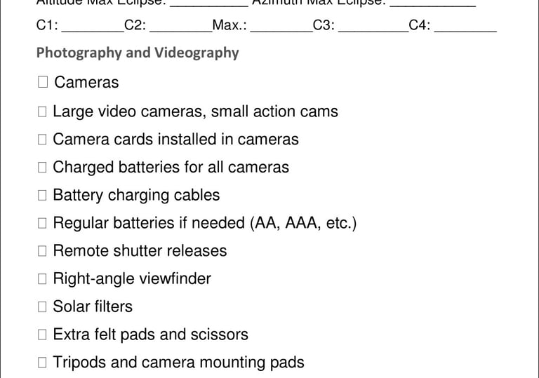This is a helpful checklist of details and items to consider and possibly bring on eclipse day. Add to it as needed for your gear or situation.