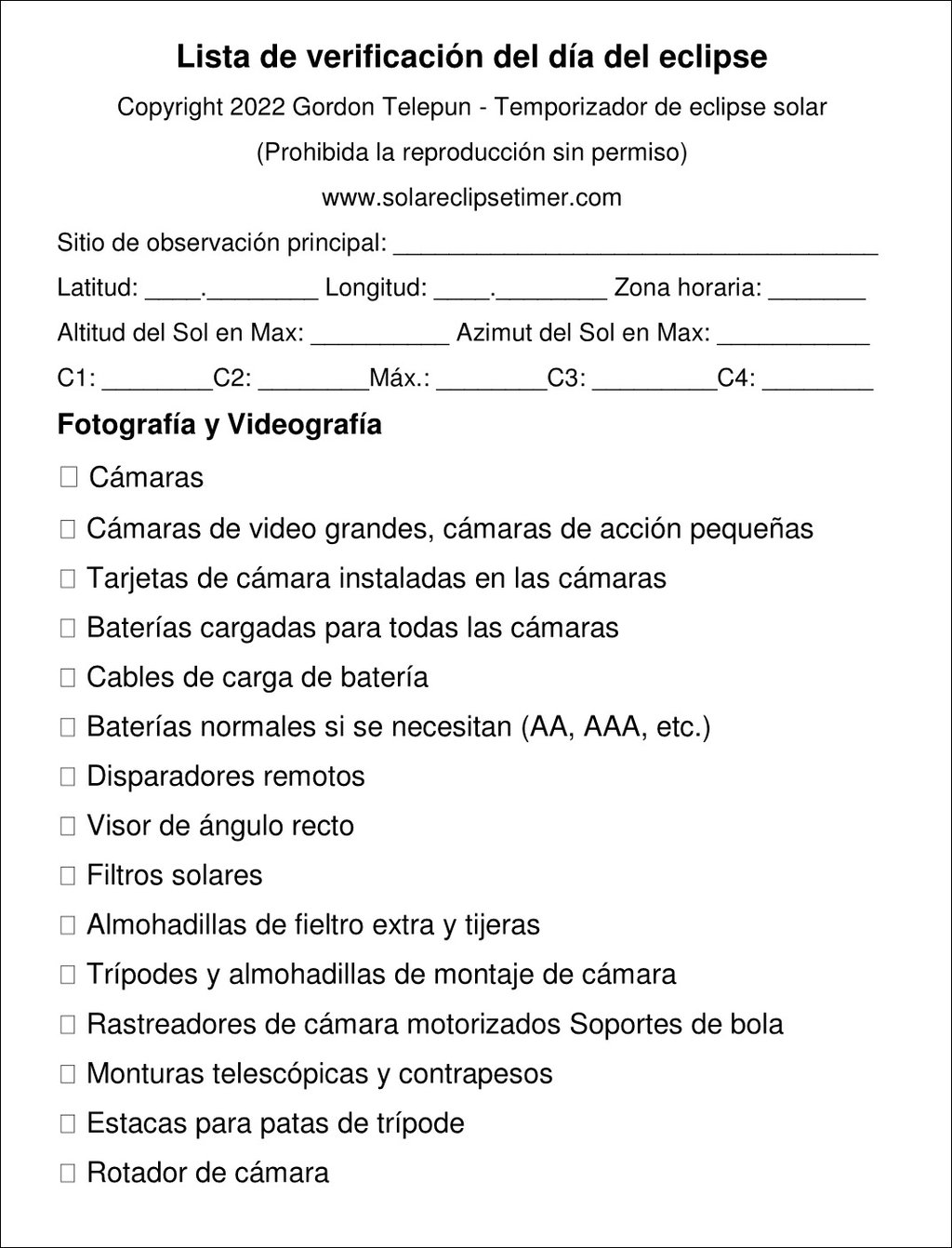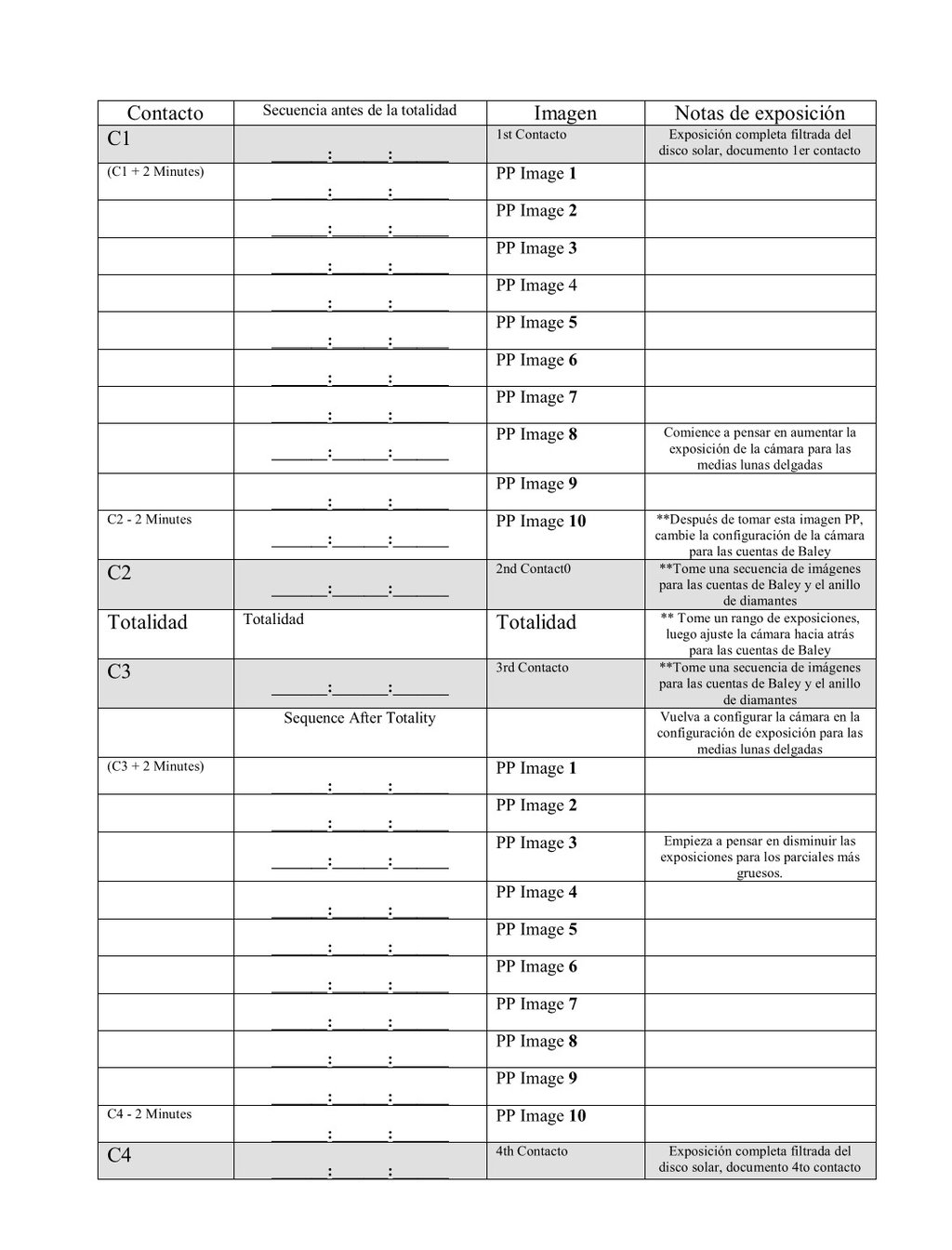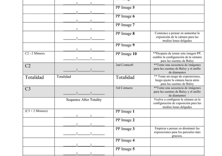 Utilice estas dos hojas para anotar las tareas de la cámara que desea realizar cuando la aplicación esté en modo Fotógrafo. Este modo no emite anuncios sobre la observación de la fase parcial; solo anuncia los tiempos, incluyendo tiempos adicionales que no se utilizan en el modo normal. Esta hoja sigue los anuncios de tiempo con precisión. Este modo fue desarrollado en colaboración con Fred Espenak.