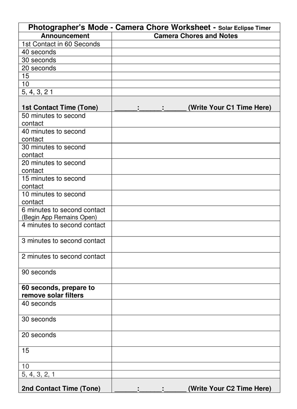Use these two sheets to write notes about the camera chores you want to do when the app is in Photographers Mode. This mode does not make partial-phase observation announcements; it only announces times, including additional times not used in regular mode. This sheet follows the time announcements exactly. This mode was developed in collaboration with Fred Espenak.