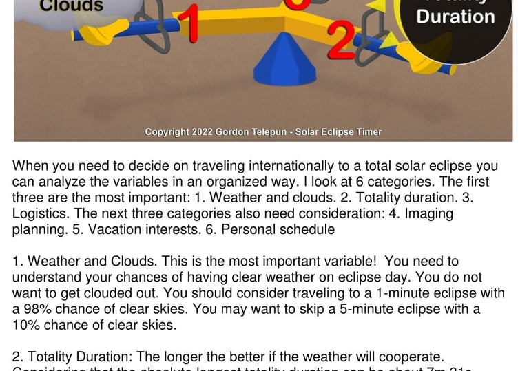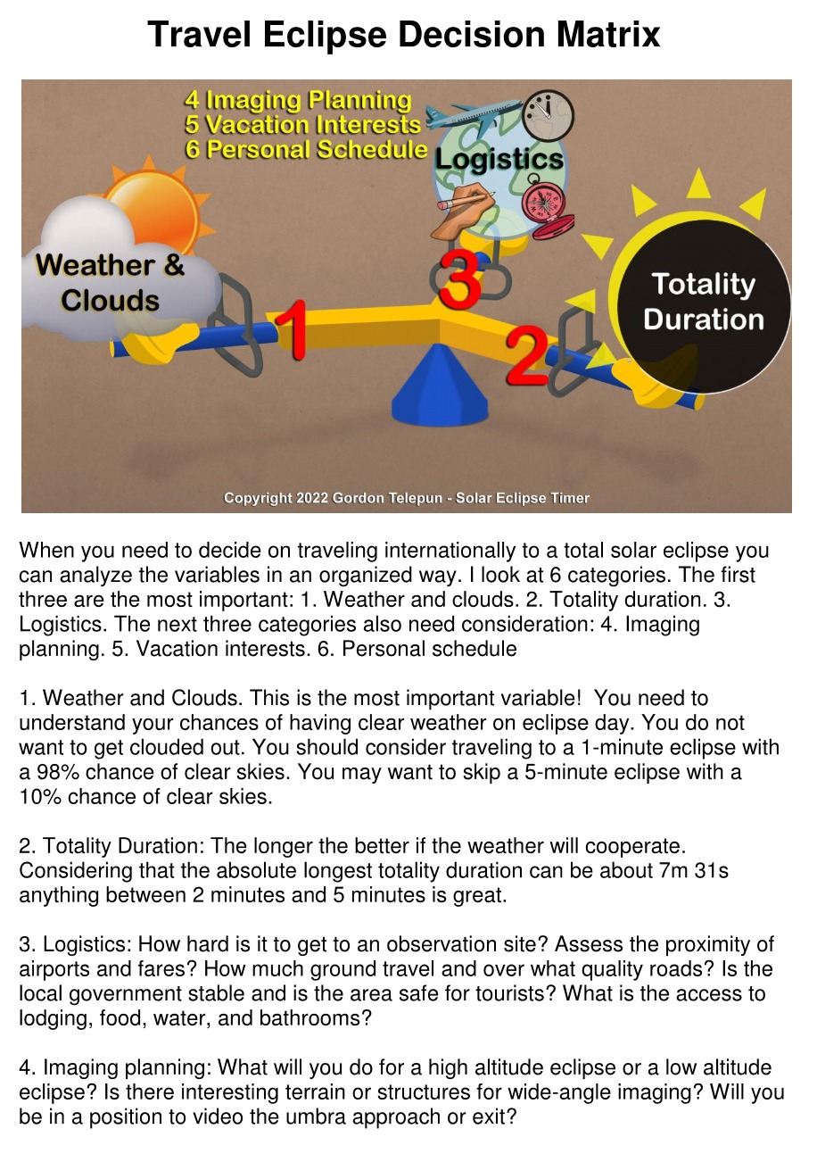 This document explains how to analyze an eclipse that requires long-distance travel. Based on what is taught in my book, it helps you determine whether or not it's a good choice based on eclipse parameters and also personal choices. It includes a blank travel matrix worksheet.