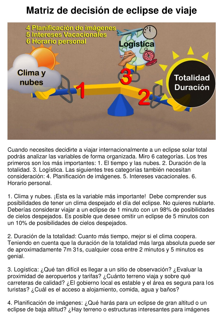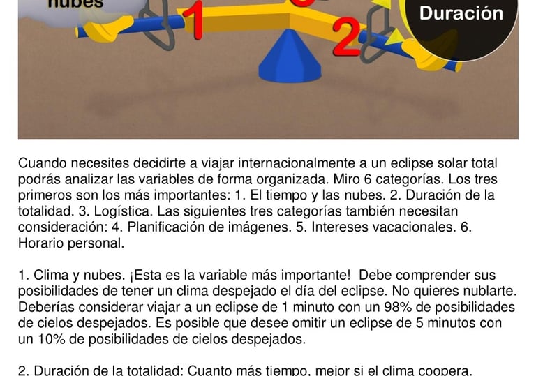 Este documento explica cómo analizar un eclipse que requiere un viaje de larga distancia. Basado en lo que se enseña en mi libro, le ayudará a determinar si es una buena opción, teniendo en cuenta los parámetros del eclipse y sus preferencias personales. Incluye una plantilla de matriz de planificación de viajes.