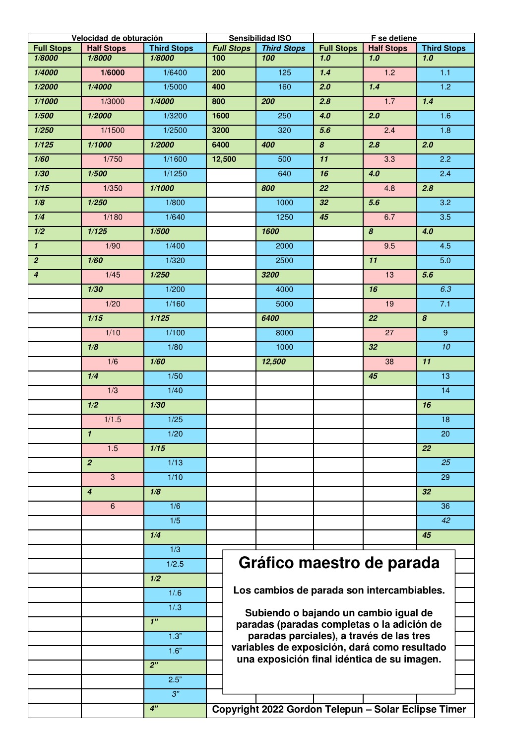 Utilice mi tabla maestra de paradas personalizada para contar las paradas de exposición hacia arriba y hacia abajo y determinar la configuración de exposición adecuada.