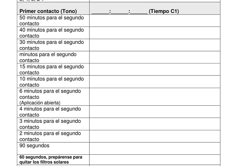 Utilice esta hoja para anotar los tiempos generados por la aplicación para su posición de observación. Estos son los 20 momentos en los que deberá tomar una imagen para obtener una secuencia perfecta del eclipse en fase parcial.