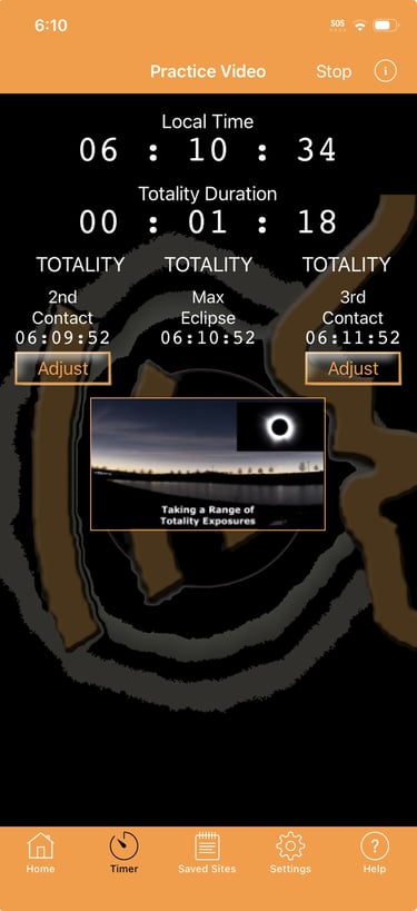 Geolocate at your site, load the contact times, the timer starts, and you hear countdown alerts. (Geolocalízate en tu ubicación, carga las horas de contacto, el temporizador se inicia y escuchas alertas de cuenta regresiva.)