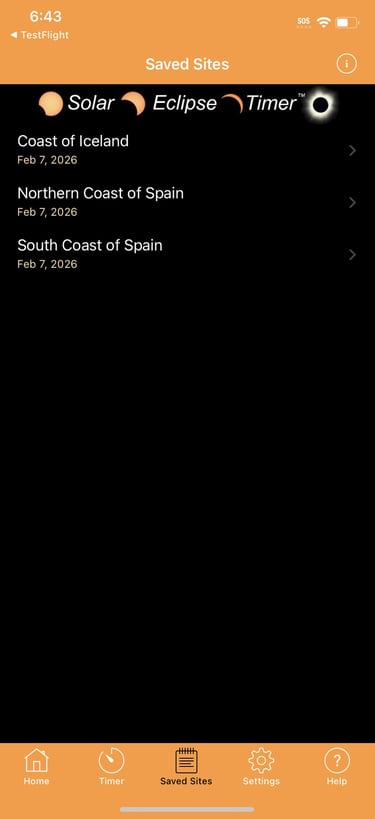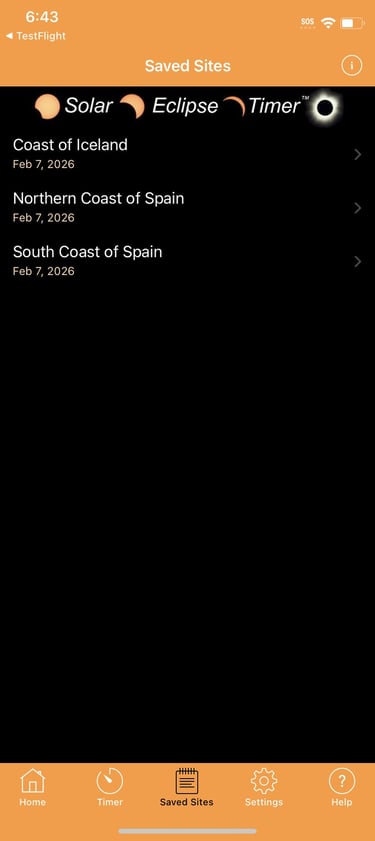 A purchase will be requested the first time you try to load the 2026 eclipse contact times into the main timer. The 2026 eclipse data set requires a one-time In-App Purchase for $1.99 US.