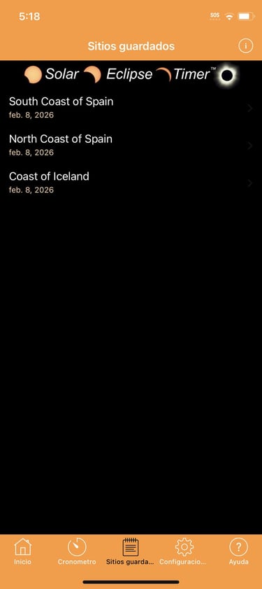Se solicitará una compra la primera vez que intente cargar los tiempos de contacto del eclipse de 2026 en el temporizador principal. El conjunto de datos del eclipse de 2026 requiere una compra única dentro de la aplicación por un precio de 1.99 USD.