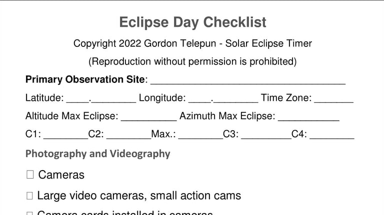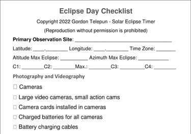 This is a helpful checklist of details and items to consider and possibly bring on eclipse day. Add to it as needed for your gear or situation.
