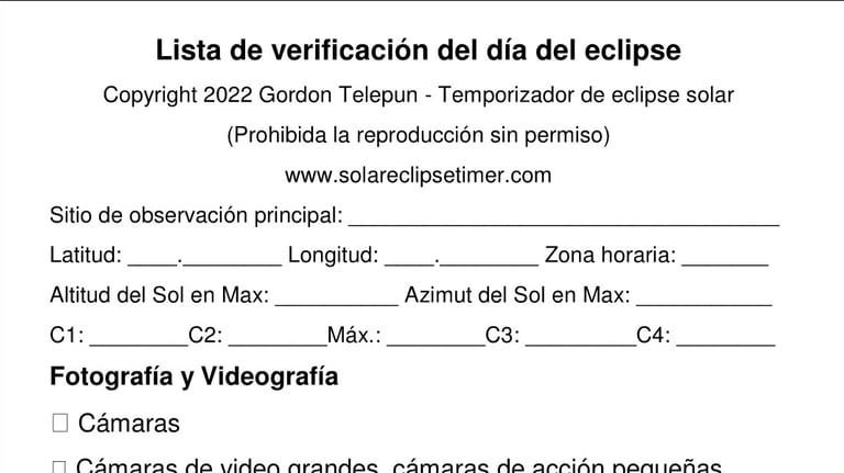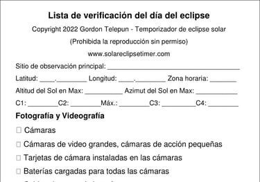 Esta es una lista útil de detalles y elementos a tener en cuenta y que quizás desee llevar consigo el día del eclipse. Complétela según sus necesidades y el equipo que utilice.