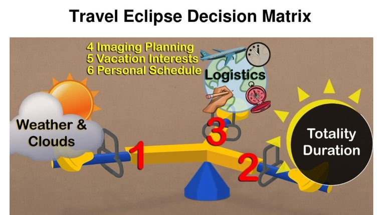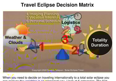 This document explains how to analyze an eclipse that requires long-distance travel. Based on what is taught in my book, it helps you determine whether or not it's a good choice based on eclipse parameters and also personal choices. It includes a blank travel matrix worksheet.