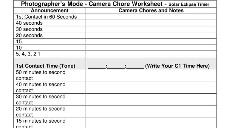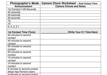 Use these two sheets to write notes about the camera chores you want to do when the app is in Photographers Mode. This mode does not make partial-phase observation announcements; it only announces times, including additional times not used in regular mode. This sheet follows the time announcements exactly. This mode was developed in collaboration with Fred Espenak.