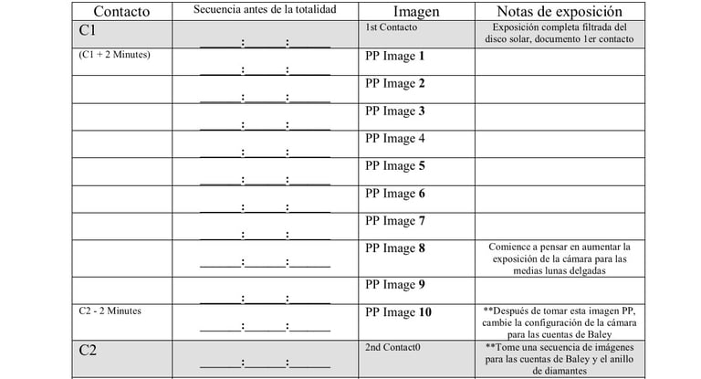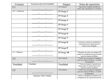 Utilice esta hoja para anotar los tiempos generados por la aplicación para su posición de observación. Estos son los 20 momentos en los que deberá tomar una imagen para obtener una secuencia perfecta del eclipse en fase parcial.